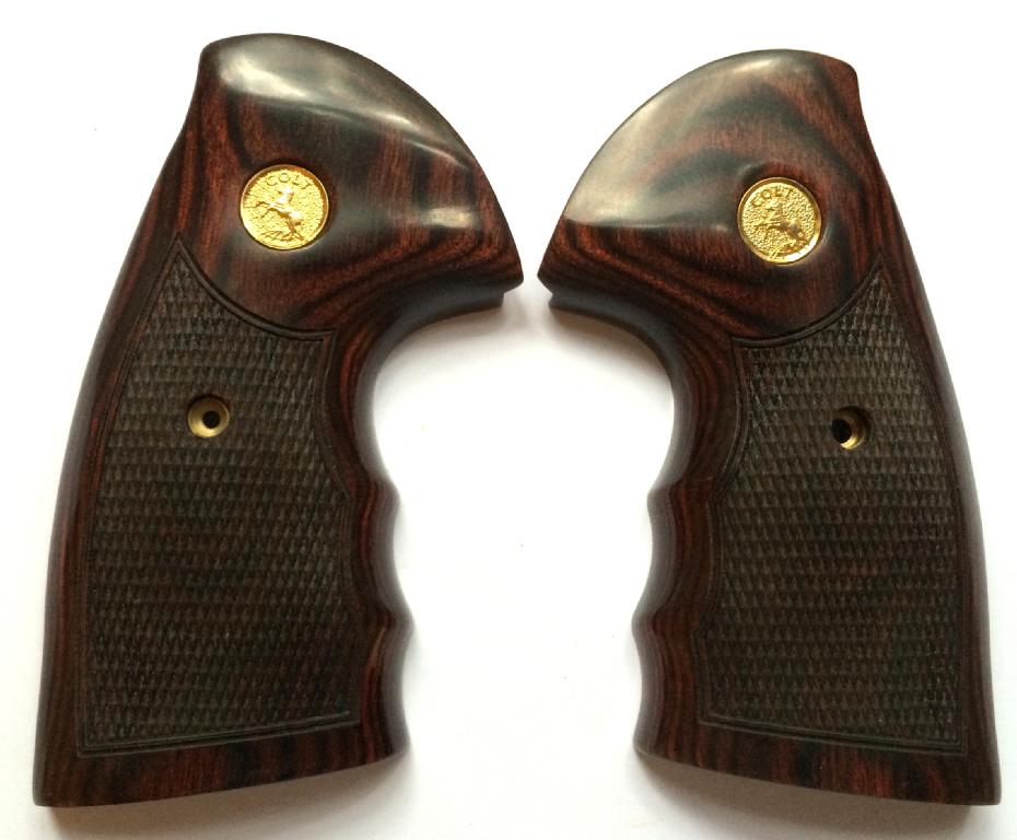 Colt Python Rosewood Dymondwood Grips.Cut Checkered.With Gold medallions.Held together on the inside with two stock pins.Oversized with Finger Grooves.Available with silver or gold colt medallions.
