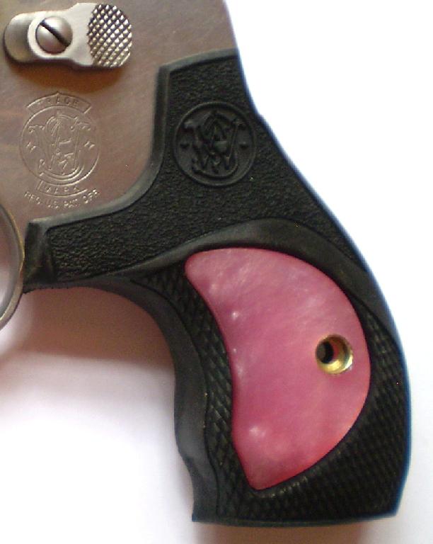 S&W J Round Rubber Boot with Imitation Pink Pearl Inserts and S&W Logo.Open back-strap and bottom of frame.Screw included.