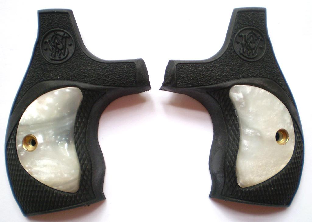 S&W J Round Rubber Boot with Imitation White Pearl Inserts and S&W Logo.Open back-strap and bottom of frame.Screw included.