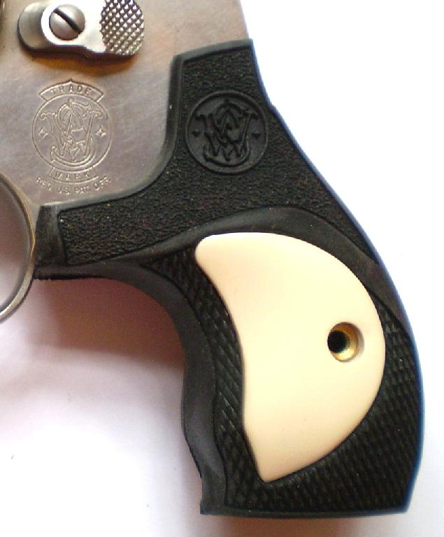 S&W J Round Rubber Boot with Bonded Ivory Inserts and S&W Logo.Open back-strap and bottom of frame.Screw included.
