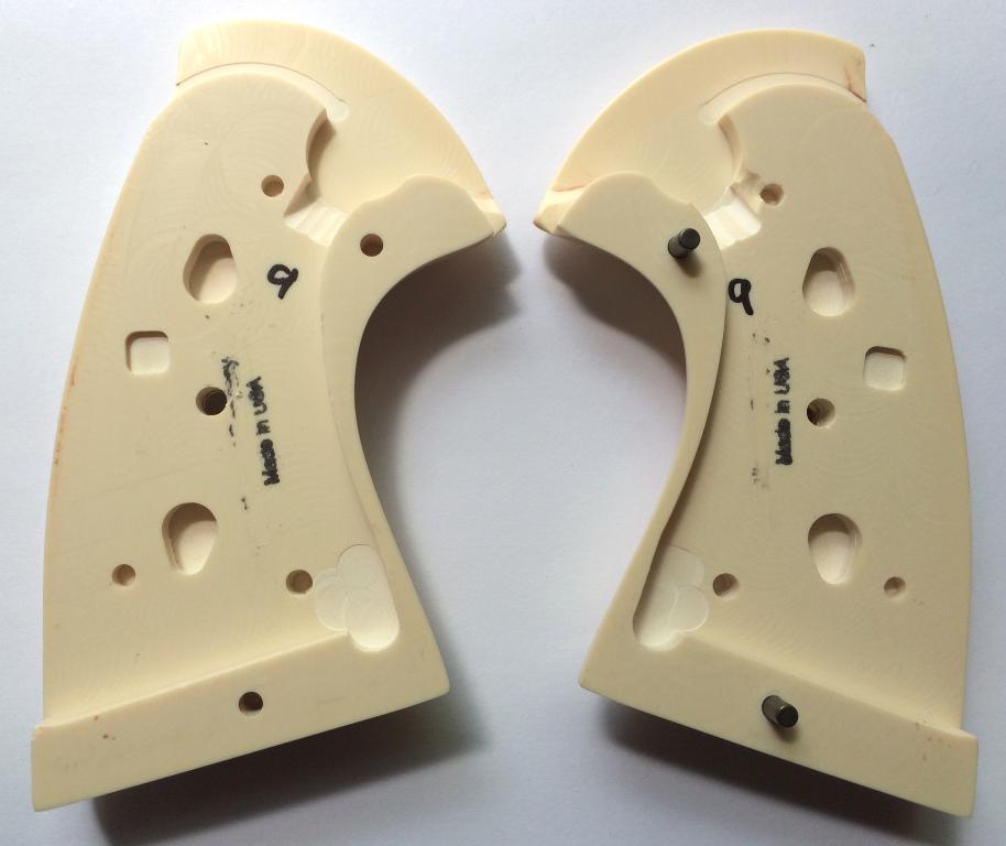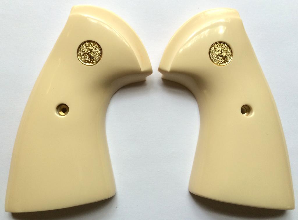 Colt Python Bonded Ivory Grips. Target Style. Held together on the inside with two stock pins. With gold colt medallions.