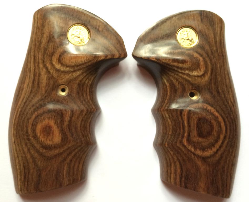 Colt King Cobra / Anaconda.Walnut Dymondwood with gold medallions.Oversized with finger grooves.Held together on the inside with two stock pins.Completely encloses whole of grip frame.
