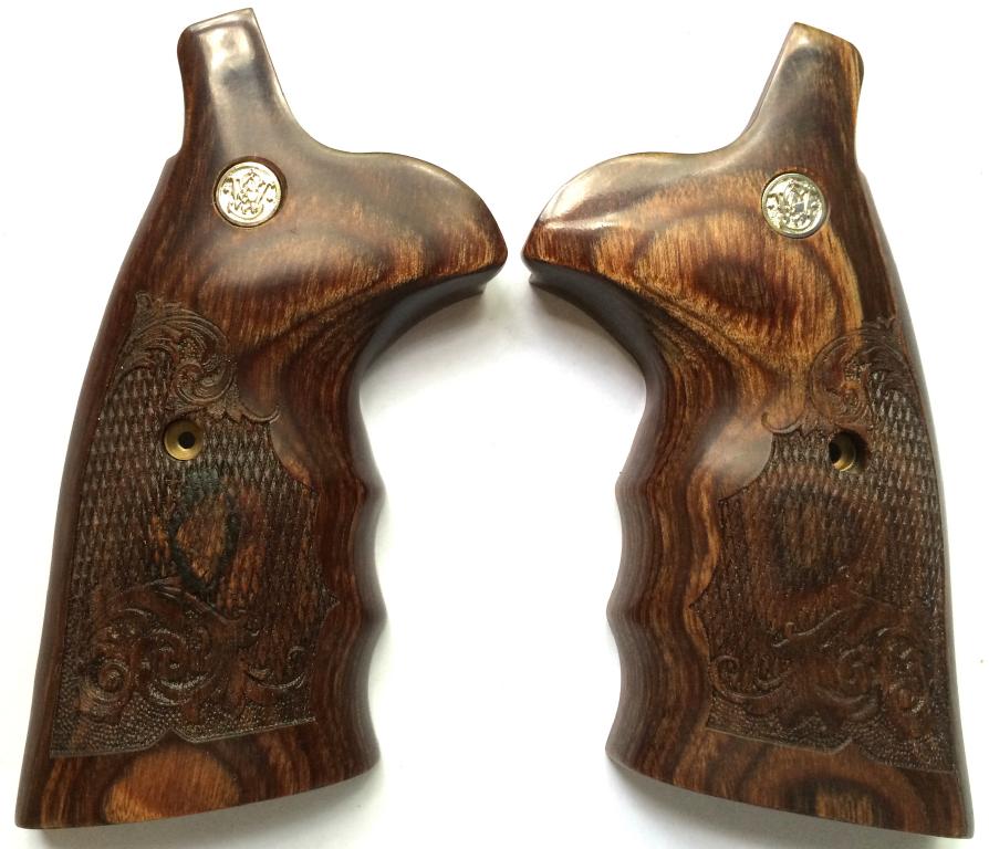 Smith & Wesson N Frame Square Butt Grips.Walnut Dymondwood.Cut Checkered and Scroll Design.With S&W medallions.Oversized with finger grooves for comfort fit to the hand.Held together on the inside with two stock pins.Screw included.