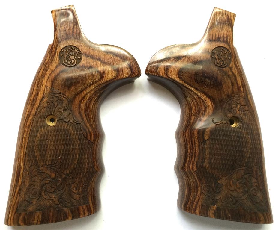 Smith & Wesson N Frame Square Butt Grips.Walnut Dymondwood.Cut Checkered and Scroll Design.With S&W Logo..Oversized with finger grooves for comfort fit to the hand.Held together on the inside with two stock pins.Screw included.