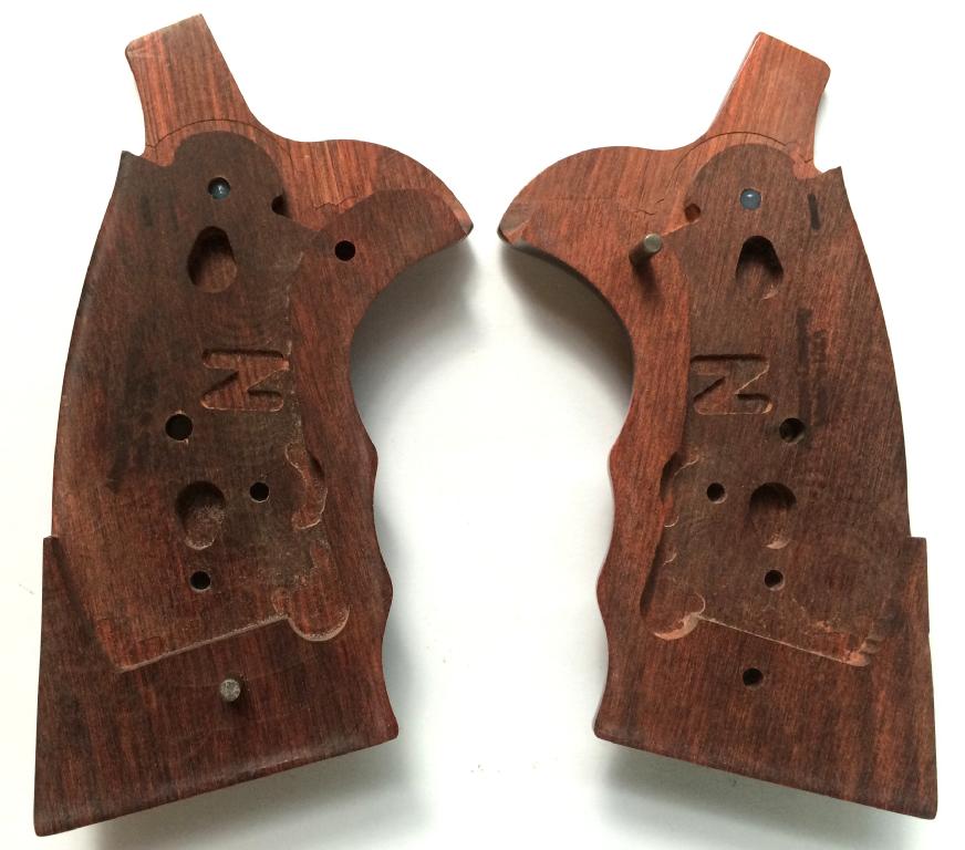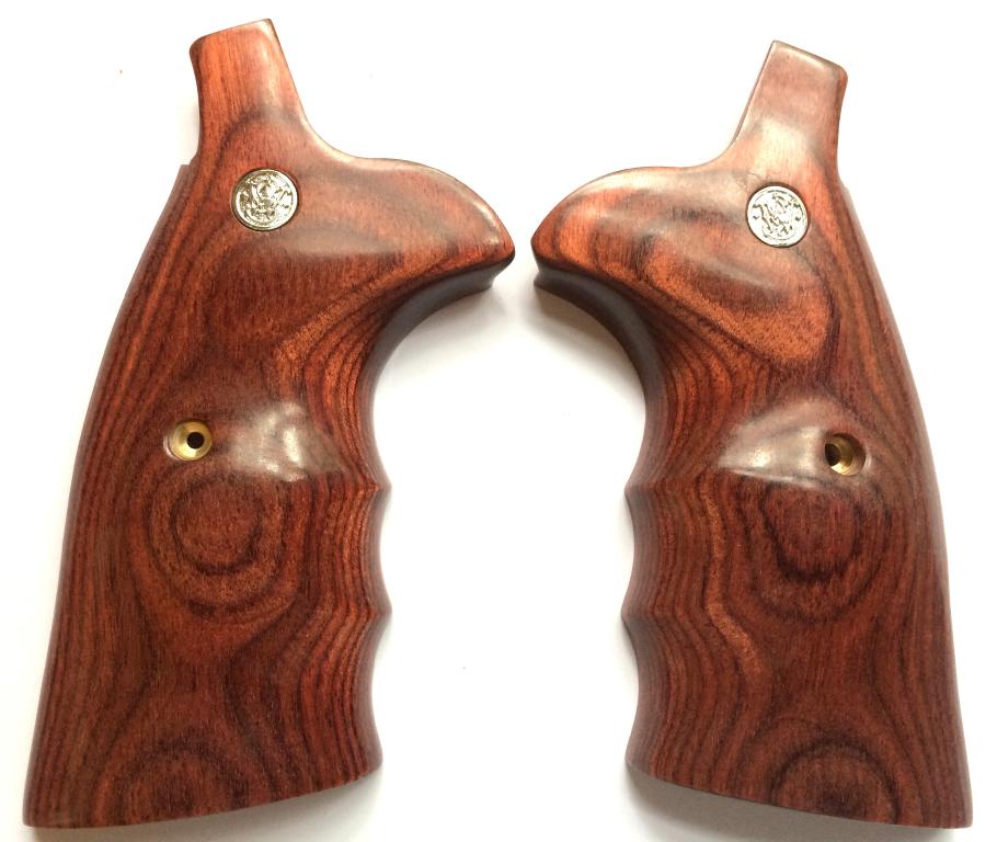 Smith & Wesson N Round to Square Butt Conversion Grips.Converts the round butt frame to the square butt frame configuration.Rosewood.With S&W Medallions.With Finger Grooves.Held together on the inside with two stock pins.Screw included.