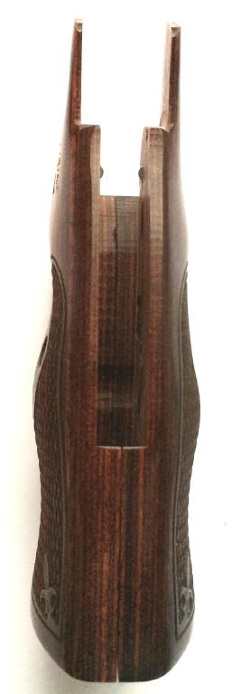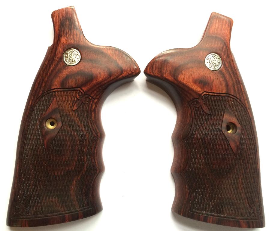 Smith & Wesson Round to Square Butt Conversion Grips. Converts the round butt frame to the square butt frame configuration. Rosewood. Cut Checkered. With S&W Medallions. With Finger Grooves. Held together on the inside with two stock pins. Screw included.