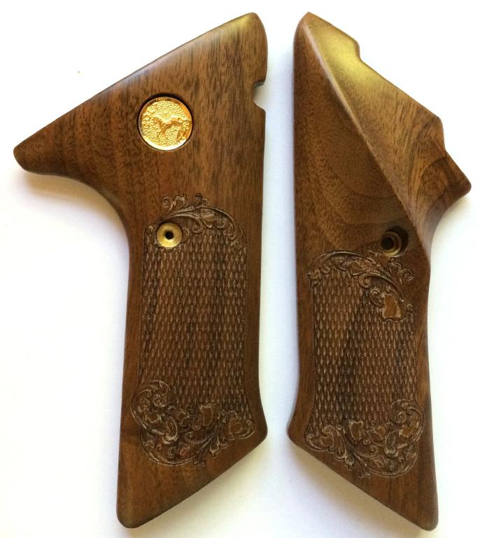 Colt Woodsman.Walnut.Cut Checkered and Engraved with Scroll Design.Gold Colt Medallion.