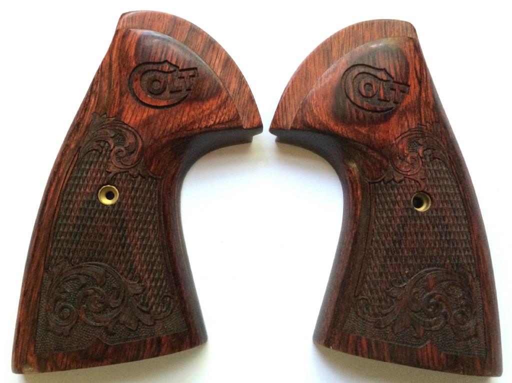 Colt Python Rosewood Target Grips.Target Style.Held together on the inside with two stock pins.Cut Checkered with Scroll Engraving.With Colt Logo.