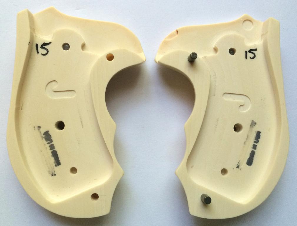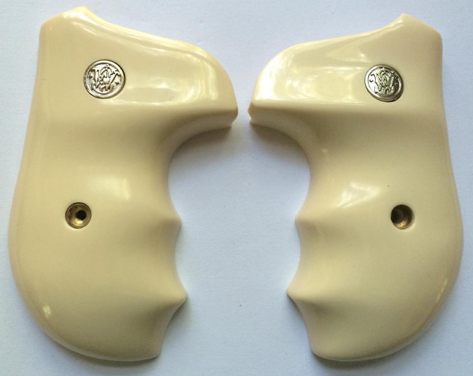Smith & Wesson J Frame Rnd butt. Bonded Ivory with S&W medallions.Completely encloses grip frame.With finger grooves for comfort fit to the hand.Held together on the inside with two stock pins.Screw included.
