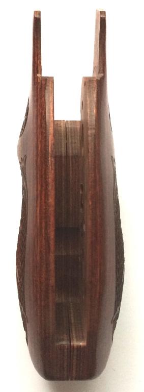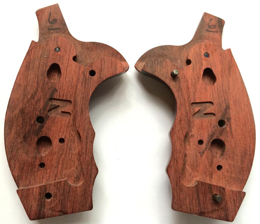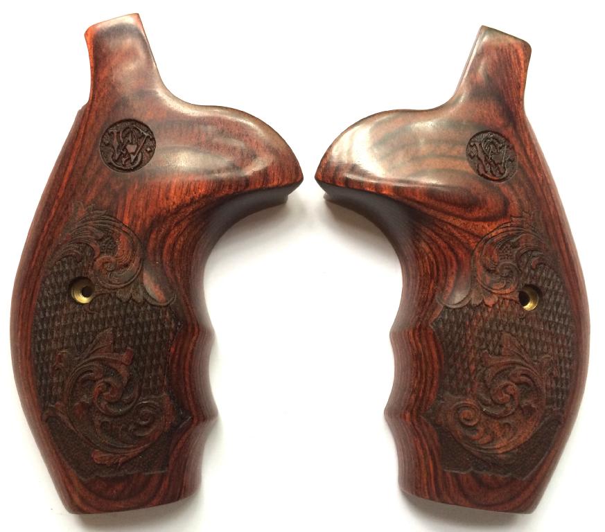 S&W N Frame Round Butt.Rosewood.Checkered and Engraved.With S&W Logo.Oversized with finger grooves.With comfort fit to the hand.Held together on the inside with two stock pins, for a tight and secure fit.Open Back-Strap.Screw Included.
