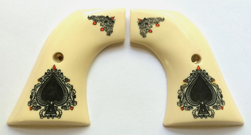 Ruger Blackhawk, Single Six, Old Army Grips EtcBonded Ivory.Scrimshaw Gambler Design.Please Note:Overtigtening of the screw on these grips, may cause them to break or crack, if this happens no warranty is given.