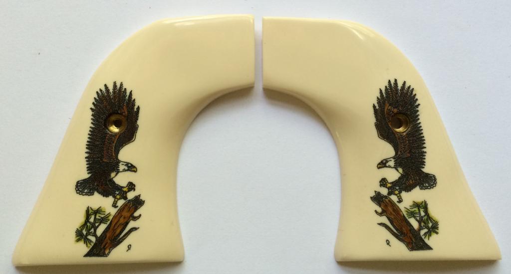 Ruger Blackhawk, Single Six, Old Army Grips EtcBonded Ivory.Landing Eagle on Branch Scrimshaw Design.Please Note:Overtigtening of the screw on these grips, may cause them to break or crack, if this happens no warranty is given.
