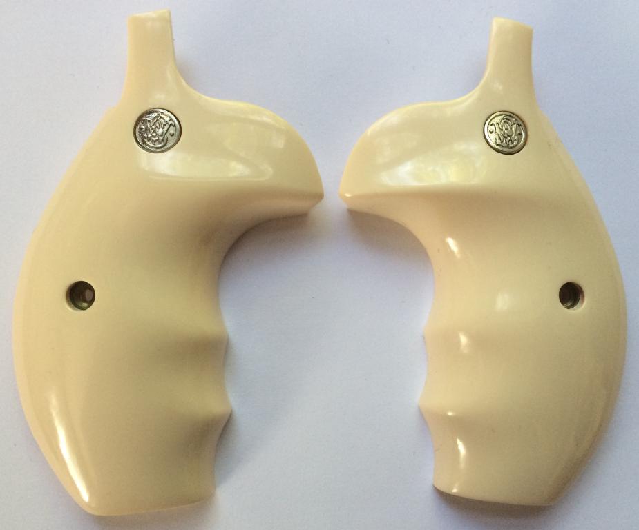 S&W K/L and X/Z Frame Round Butt. Bonded Ivory. With S&W Medallions. Oversized with finger grooves. With comfort fit to the hand. Held together on the inside with two stock pins, for a tight and secure fit. Open Back-Strap. Screw Included. Bonded Ivory is a resin.