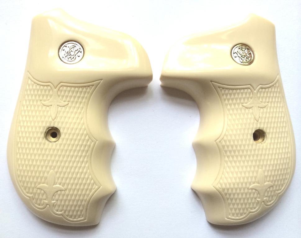 Smith & Wesson J Frame Rnd butt. Bonded Ivory with S&W medallions. Cut Checkered with Fleur-de-lys design. Completely encloses grip frame. With finger grooves for comfort fit to the hand. Held together on the inside with two stock pins. Screw included.