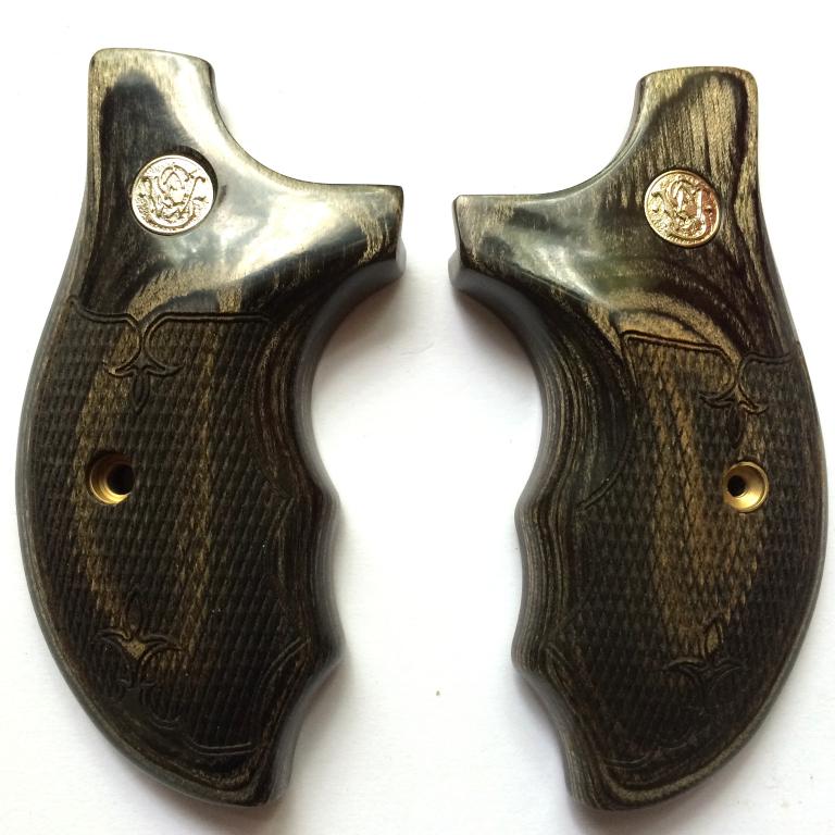 Smith & Wesson J Frame Rnd butt. Silverblack dymondwood with S&W medallions. Combat Style. Cut Checkered with fleur-de-lys design. Open Back-Strap. Held together on the inside with two stock pins. The silverblack really enhances the finish on stainless and nickel. Screw included.