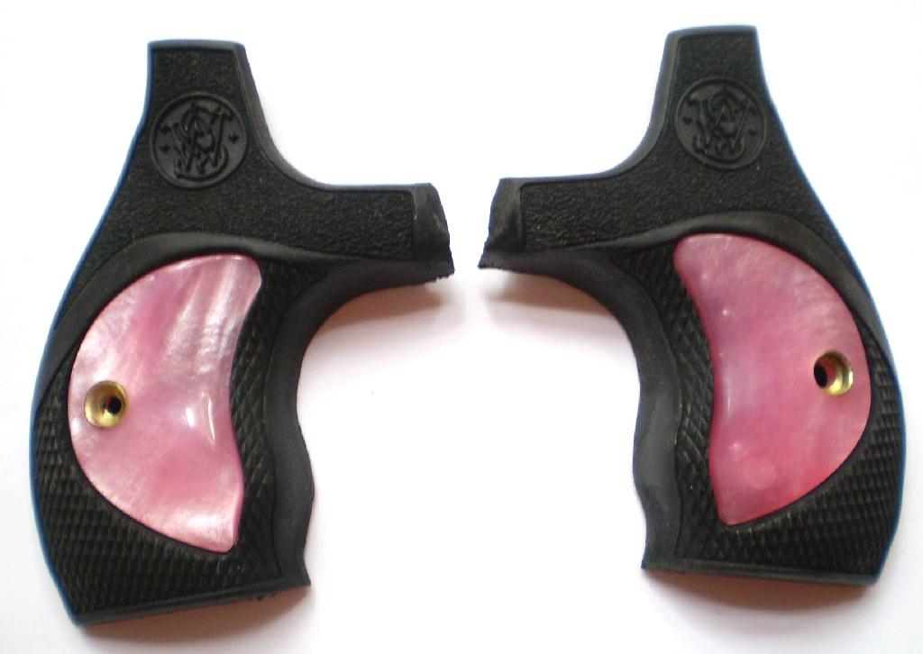 S&W J Round Rubber Boot with Imitation Pink Pearl Inserts and S&W Logo.Open back-strap and bottom of frame.Screw included.