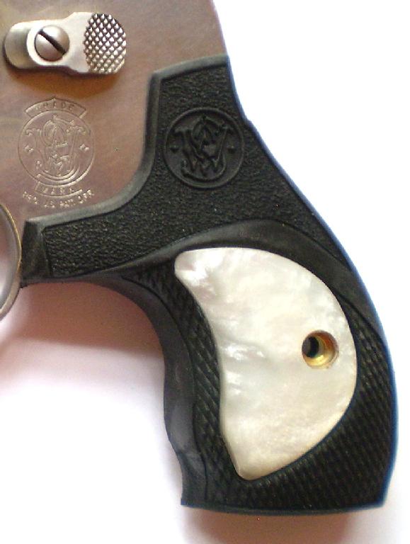 S&W J Round Rubber Boot with Imitation White Pearl Inserts and S&W Logo.Open back-strap and bottom of frame.Screw included.