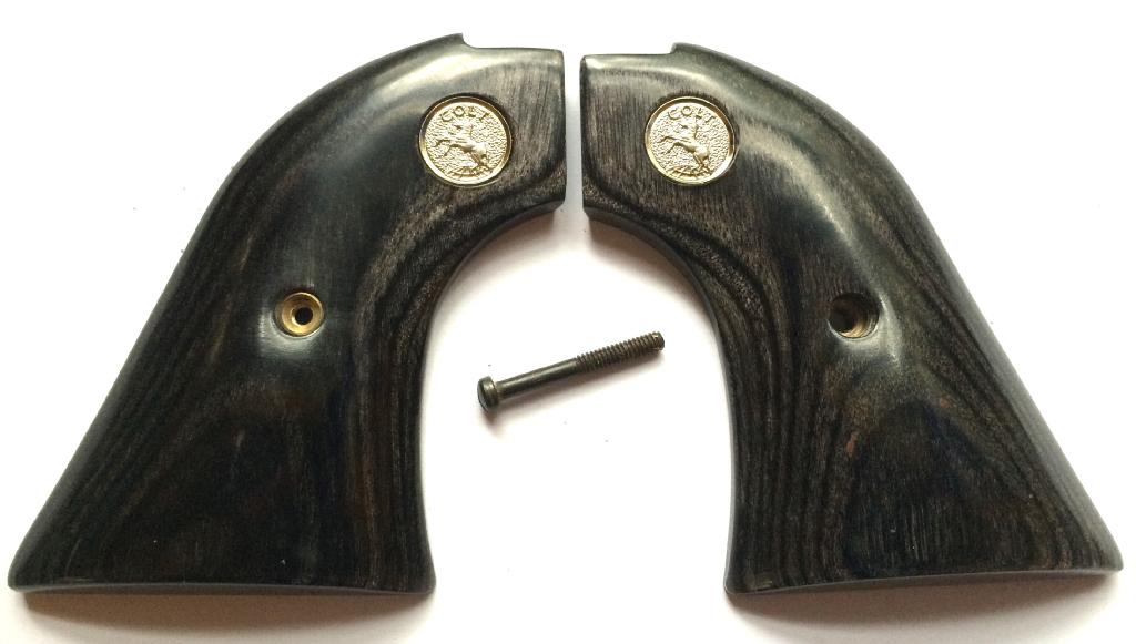 Colt Frontier / Scout Grips.Silverblack Dymondwood.With silver colt medallions.Screw included.The silverblack really enhances the finish on stainless and nickel.