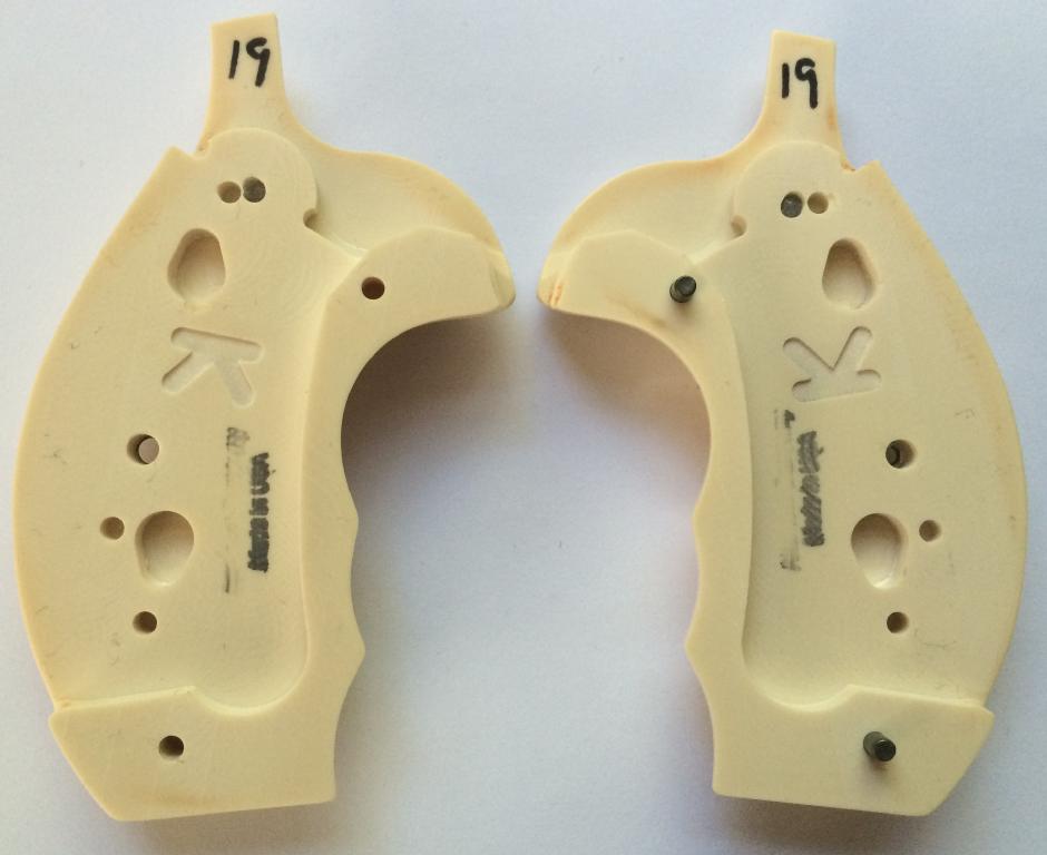 S&W K/L and X/Z Frame Round Butt. Bonded Ivory. With S&W Medallions. Oversized with finger grooves. With comfort fit to the hand. Held together on the inside with two stock pins, for a tight and secure fit. Open Back-Strap. Screw Included. Bonded Ivory is a resin.
