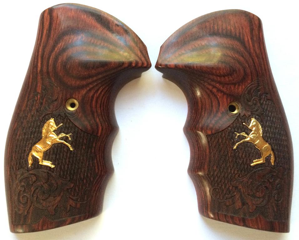 Colt King Cobra / Anaconda.Rosewood Dymondwood with Colt Gold Horse.Cut Checkered with scroll design.Oversized with finger grooves.Held together on the inside with two stock pins.Screw Included.Completely encloses whole of grip frame.