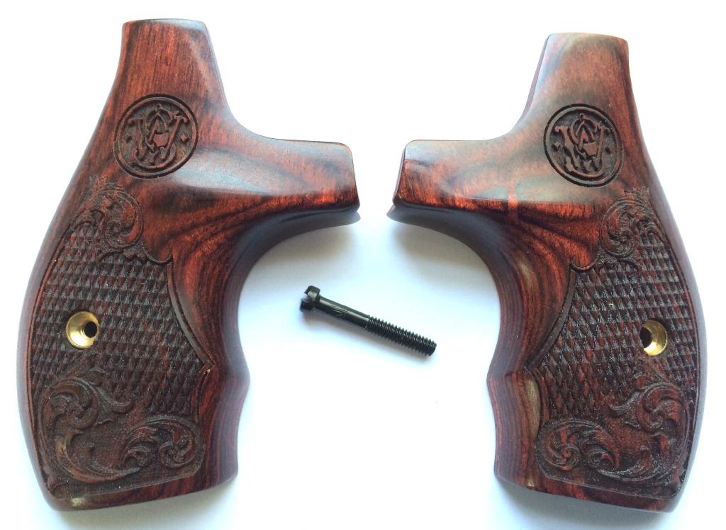 Smith & Wesson J Frame Round butt.Rosewood Dymondwood with S&W Logo.Boot Style.Cut Checkered with Scroll design.For Easy Concealment.Open Back-Strap and Open on Bottom of Frame.Held together on the inside with two stock pins.Screw included.