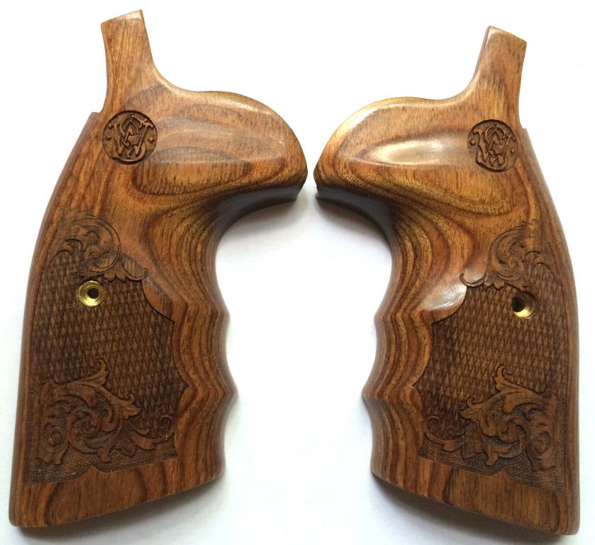 Smith & Wesson Round to Square Butt Conversion Grips. Converts the round butt frame to the square butt frame configuration. Walnut Cut Checkered and Engraved with Scroll design. With S&W Logo. With Finger Grooves. Held together on the inside with two stock pins. Screw included.