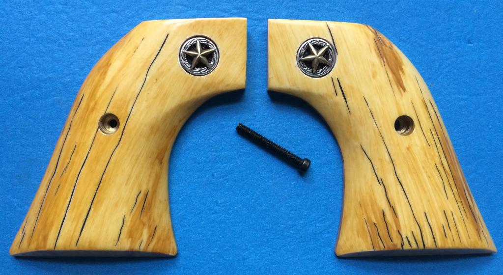 Ruger New Vaquero / Montado Grips.Imitation Aged Bonded Ivory.With Star Medallions.Please Note:Overtigtening of the screw on these grips, may cause them to break or crack, if this happens no warranty is given.